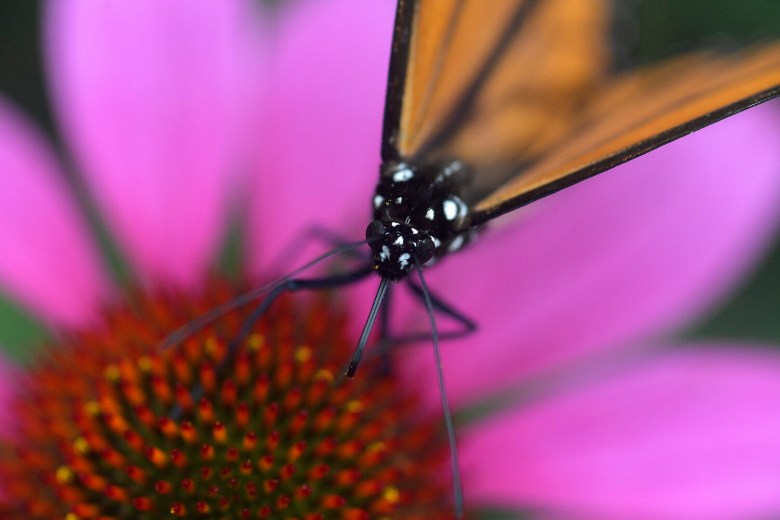 GARDINER, ME - AUGUST 9: A Monarch Butterfly extends Monday August 9, 2021 a proboscis to suck pollen from a plant on the Gardiner waterfront along the Kennebec River. Flower beds abutting the river that are cultivated by the volunteer brigade of Gardiner Gardners have become a natural magnet for bees, butterflies and hummingbirds as the plants have blossomed. Andy Molloy/Kennebec Journal