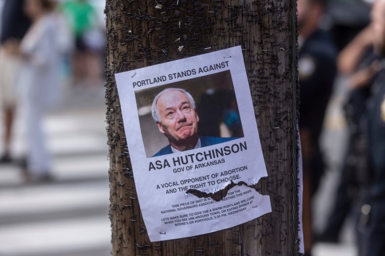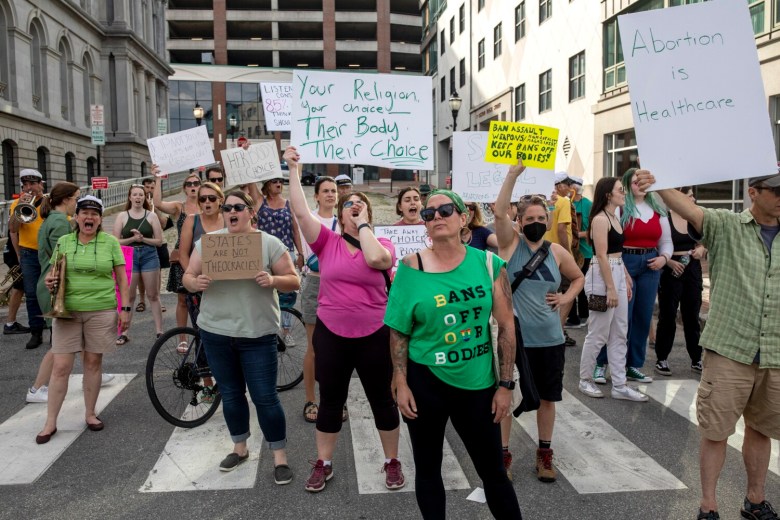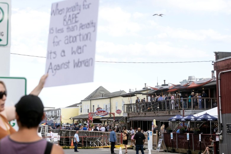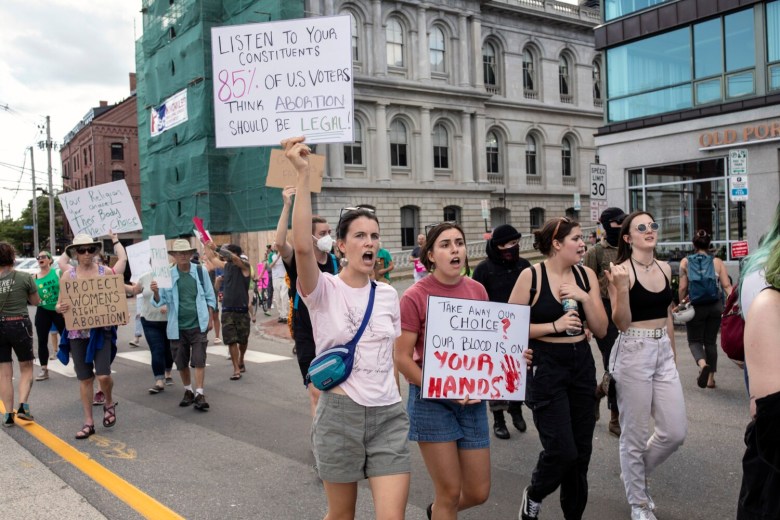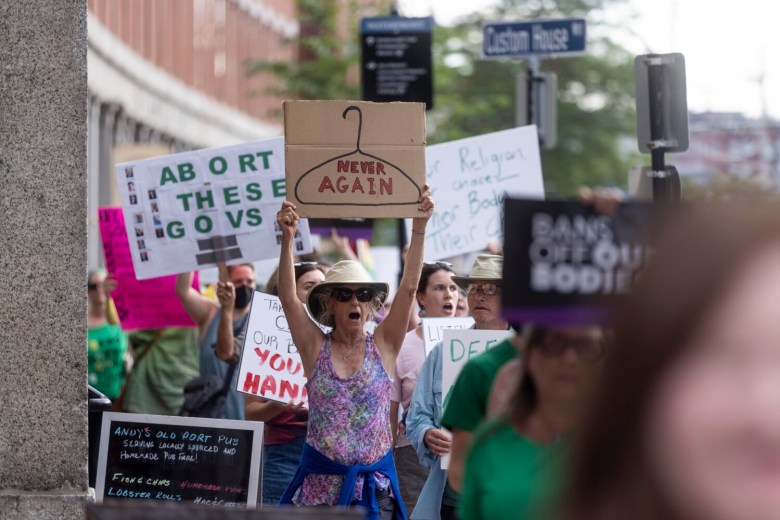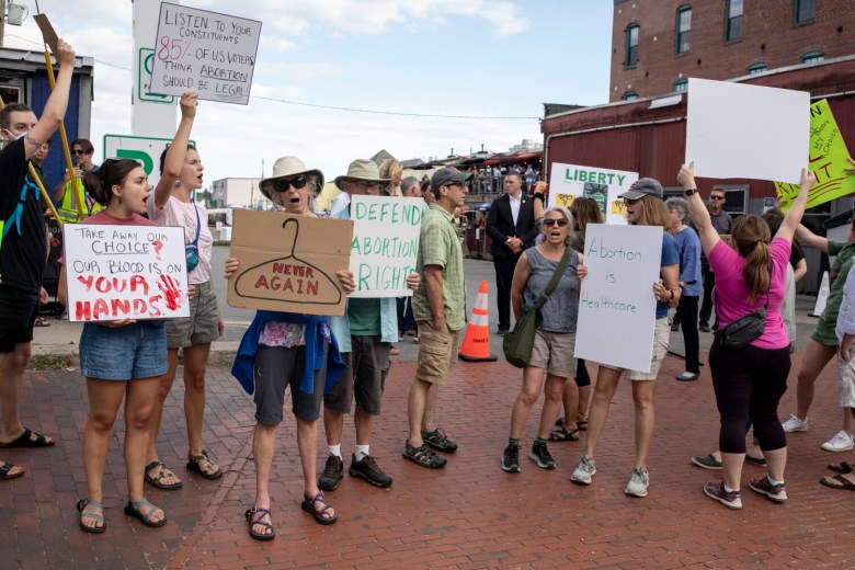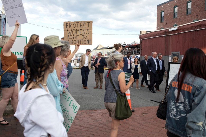 Further down the street from Boone’s, protesters hung a giant banner in front of the Casco Bay ferry terminal that said, “(expletive) DeSantis.” Ron DeSantis, Florida’s Republican governor, was not expected to attend the NGA conference. After the court’s decision, DeSantis announced he intended to expand “pro-life protections.”