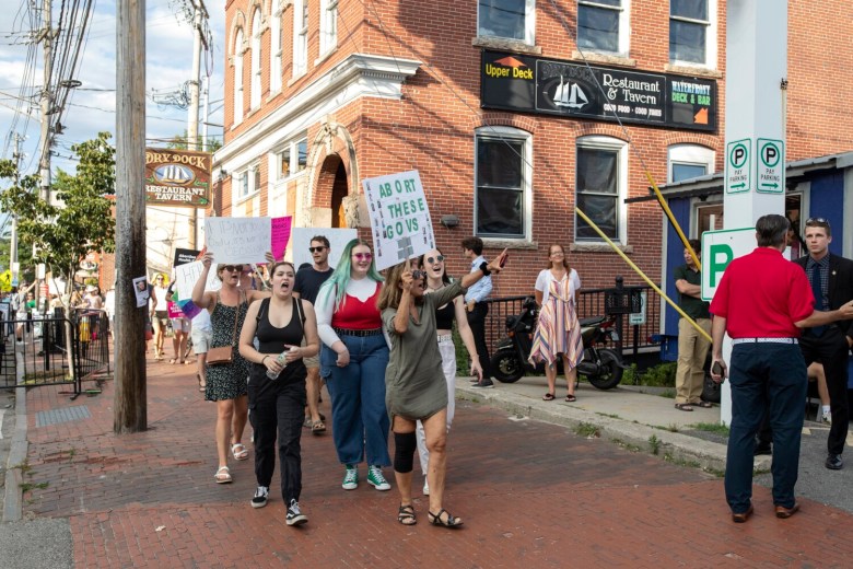 At one point, the abortion-rights protesters blocked the entrance to Boone’s parking lot. Police officers directed them to protest across the street. They complied and the demonstration ended peacefully a few minutes later. But emotions over the Supreme Court’s decision to overturn Roe v. Wade were still running high. One male protester yelled, “Get these fascist governors out of Maine.”