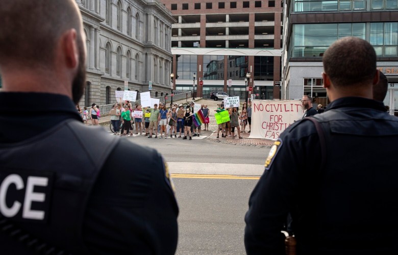 While the governors were welcomed into the private event, a group of reproductive rights protesters began to gather near the city’s Custom House, displaying a large banner that read, “No Civility for Christian Fascists.”
