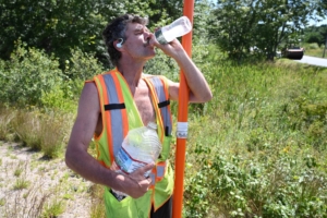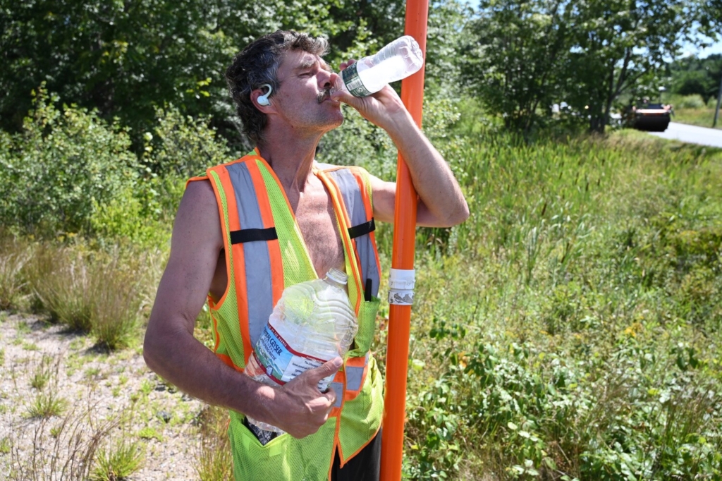Bradley Taggett takes a sip of ice water during a break from work while working in the heat earlier this month. Press Herald file photo