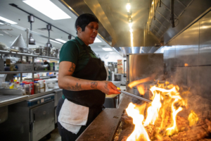 Marquea Braxton flips steaks on the grill at Woodholme Country Club in Pikesville, Md., where temperatures in the kitchen can exceed 100 degrees. Photo by Amanda Andrade-Rhoades for The Washington Post
