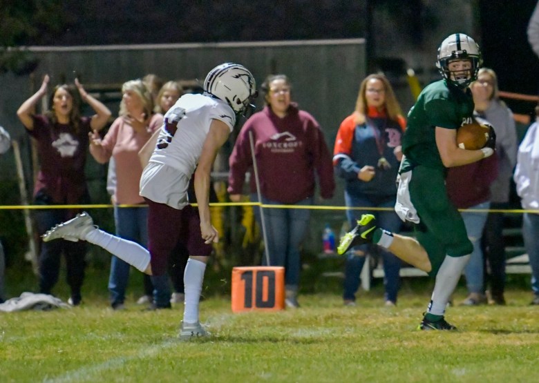 There the score stood until overtime, and Foxcroft took the ball at the Ramblers’ 10-yard line. Rayfield’s first-and-goal pass to Crocker was incomplete, but the officials flagged the Ramblers for pushing the receiver, and the Ponies gained 5 yards. Rayfield hit Crocker on the far left corner, and Marsters’ extra point made it 28-21.