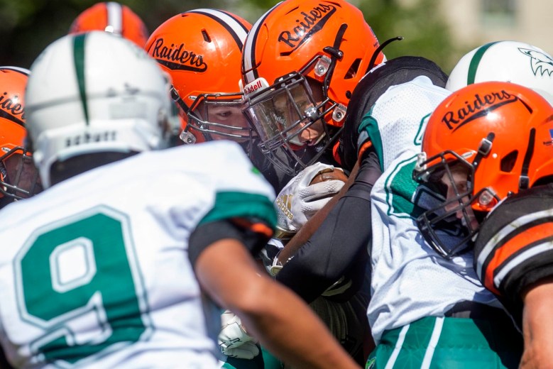 The Black Raiders rolled to victory in classic style, pounding the Old Town defense with their run game out of the double-wing formation. Junior Matt Quirion and senior Pedro Garcia provided the 1-2 punch in the backfield, with Quirion rushing for 191 yards on 10 carries, scoring two touchdowns. Garcia ran for 120 yards on 11 carries and scored four touchdowns.