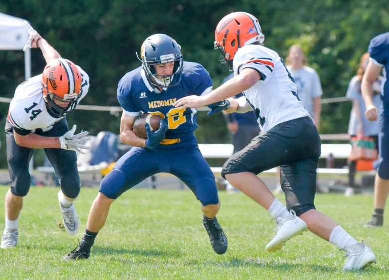 Staples rushed for 163 yards on 22 carries for Medomak Valley, and Reed, who ran it in for the Panthers’ last touchdown midway through the fourth quarter, had 76 yards on 13 carries. Quarterback Wyatt Simmons, who completed 13 passes for 140 yards last week, completed just three for 42 yards this week as the Panthers stuck with the run game.