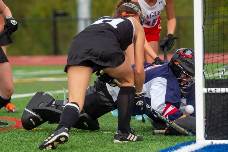 Messalonskee goalie Nealey Dillon makes the initial save on a shot by Skowhegan’s Norie Tibbetts with a scoring rebound by teammate Masyn Atwood in a field hockey game Thursday in Oakland. Michael G. Seamans/Morning Sentinel