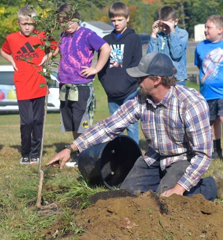 Richard Hodges, the founder and project manager of ReTreeUS, explains to students Thursday where two pear trees were grafted together while the tree is planted at Windsor Elementary School. Joe Phelan/Kennebec Journal
