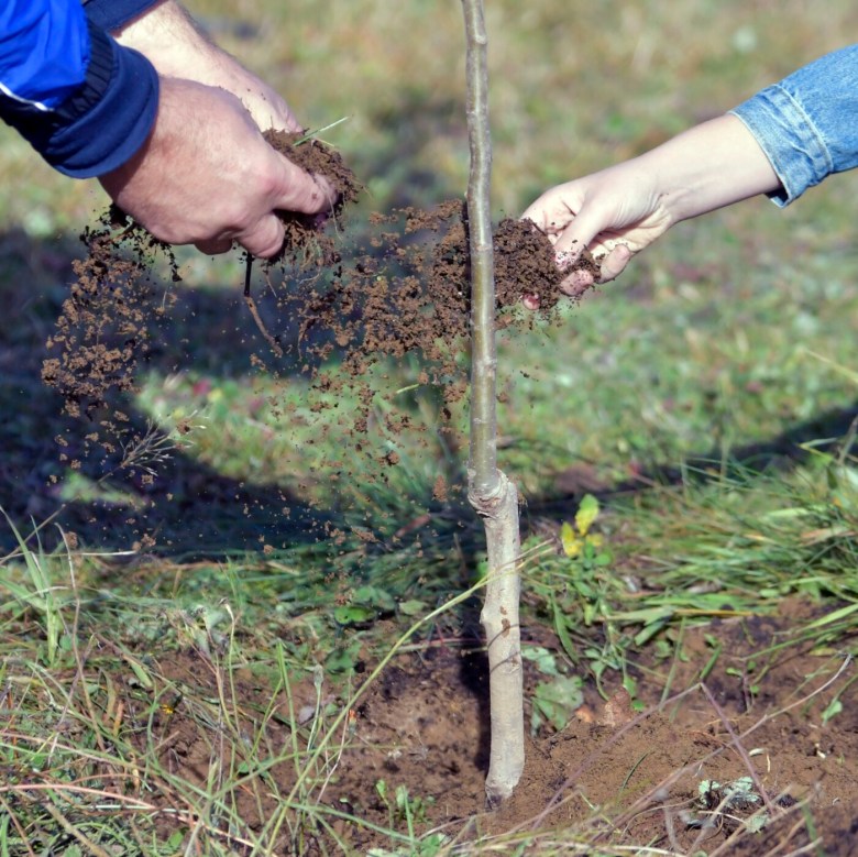 Soil is placed Thursday around a newly planted pear tree at Windsor Elementary School. Joe Phelan/Kennebec Journal
