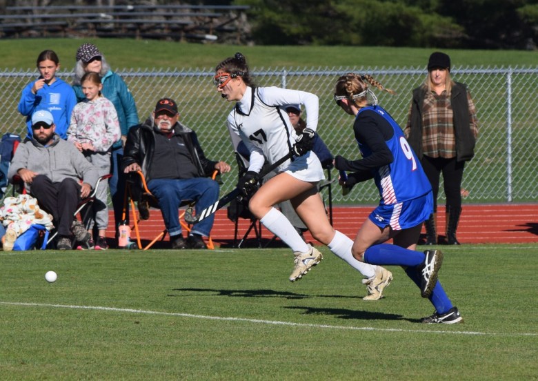 Skowhegan field hockey player Ellie Quinn, left, runs ahead of Mt. Ararat’s Lily Anderson during a Class A North semifinal game Saturday in Skowhegan. Eric Maxim/The Times Record