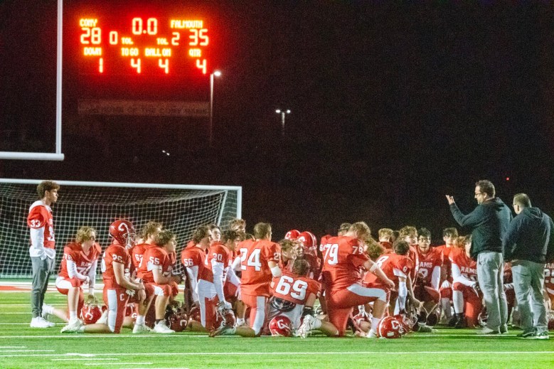 Cony drove the ball downfield on its next possession, but stalled at the Falmouth 45 after Rams quarterback Dom Napolitano fired a pair of incompletions intended for Kam Douin. Falmouth took over from there and ran out the clock, highlighted by Caxton-Smith’s 24-yard completion to Peyton Mitchell — who had missed the last several weeks with an injury — on 4th-and-5 from Cony’s 40.