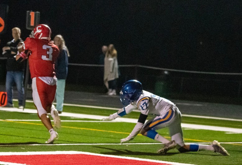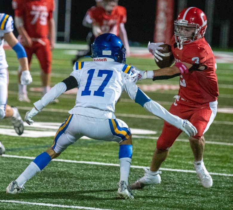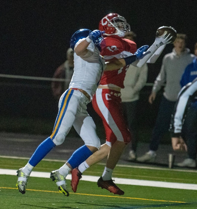 Cony responded with a pair of big plays of its own to close the period. Napolitano hit Douin for 59 yards to cut the deficit to 21-14, then tied the score at 21-all with 15 seconds left in the half when Caxton-Smith’s pass toward the end zone was picked off by Jasper Parrilli, who ran nearly 100 yards down the right sideline for the pick-six.