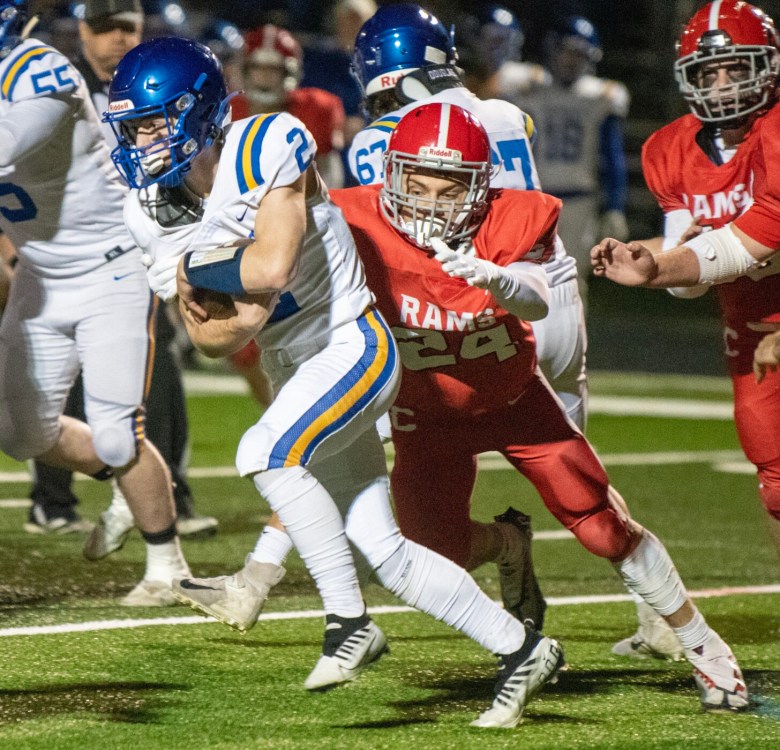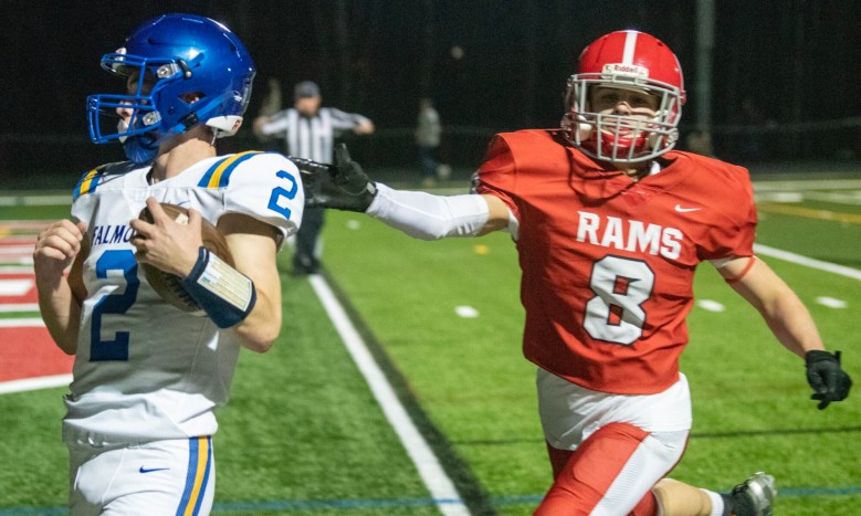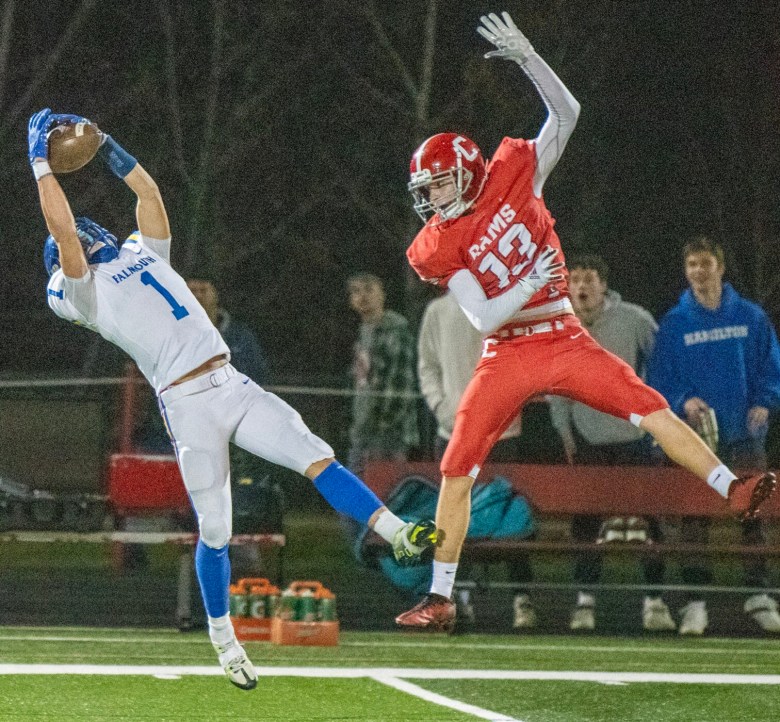 Cony drove the ball downfield on its next possession, but stalled at the Falmouth 45 after Rams quarterback Dom Napolitano fired a pair of incompletions intended for Kam Douin. Falmouth took over from there and ran out the clock, highlighted by Caxton-Smith’s 24-yard completion to Peyton Mitchell — who had missed the last several weeks with an injury — on 4th-and-5 from Cony’s 40.