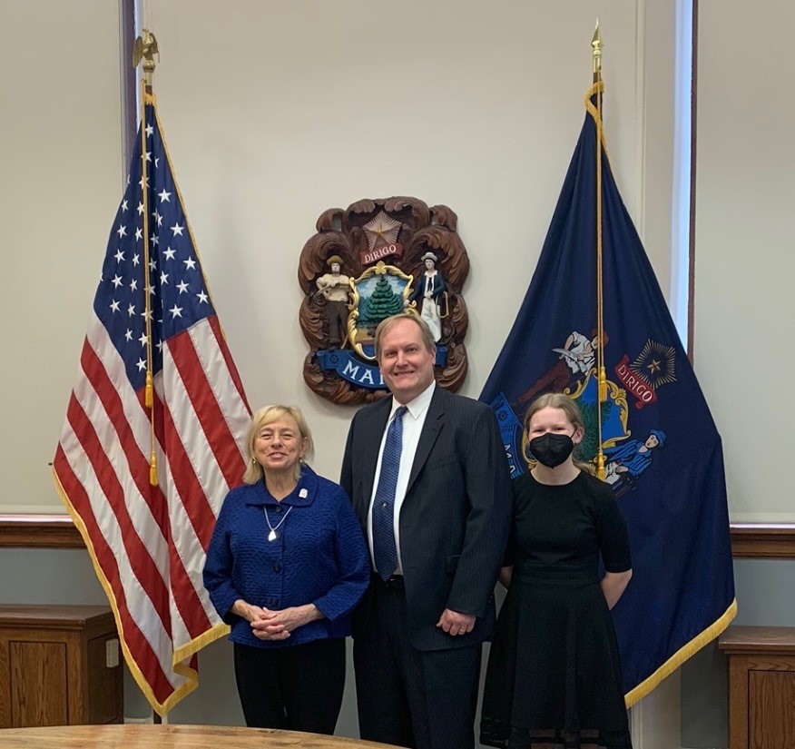 Gov. Janet Mills is seen with Joel Pike of Jay and his daughter, Cecilia following his reappointment to the Maine School of Science and Mathematics Board of Trustees on Sept. 20 in Augusta. Submitted photo