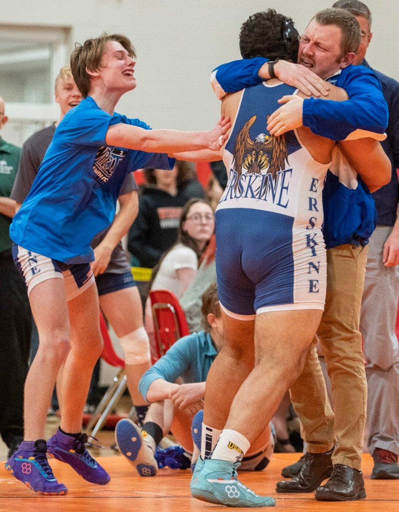 Senior Tyreke Burke led the Erskine Academy wrestling team to a second-place finish (100 points) for the KVAC B title, behind champion Oceanside (109 points). Belfast (99 points) finished third. Burke beat Skowhegan’s Kobe Butters by pinfall in the first period to win the 285 title.