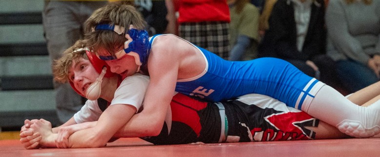 Two of Burke’s teammates also won KVAC titles. Wynn Pooler beat Mt. Blue’s Noah Krysztofiak for the 113 crown, and Timber Parlin pinned Reilly Turner-Watts of Camden Hills for the 182 title.