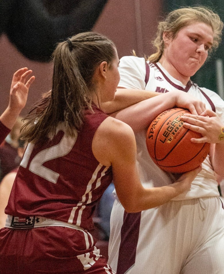 Monmouth’s Kaitlyn Frost scored a team-high 16 points, all in the second half. She drilled a trio of treys in the final period to cut into Kents Hill’s 42-23 lead through three quarters. The Mustangs closed the night on a 9-0 run, all but Frost’s final triple coming with the Huskies having emptied the bench in favor of their reserves.