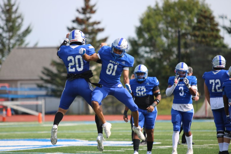 The game couldn’t have started off much better for Colby. Trinity (2-0) got the ball to start the game, and the Mules forced a turnover on downs just shy of midfield. Colby then mounted a 10-play, 55-yard drive that culminated with a 5-yard touchdown pass from Miles Drake to Jack Sawyer with 8:04 left in the first quarter.