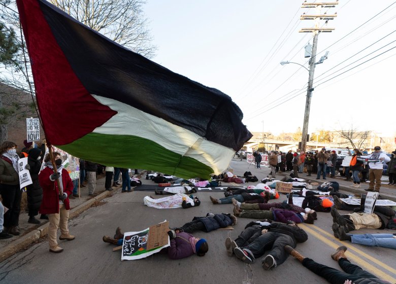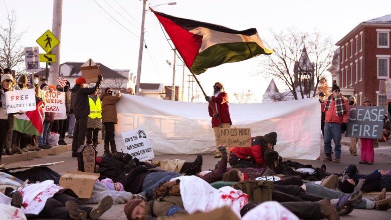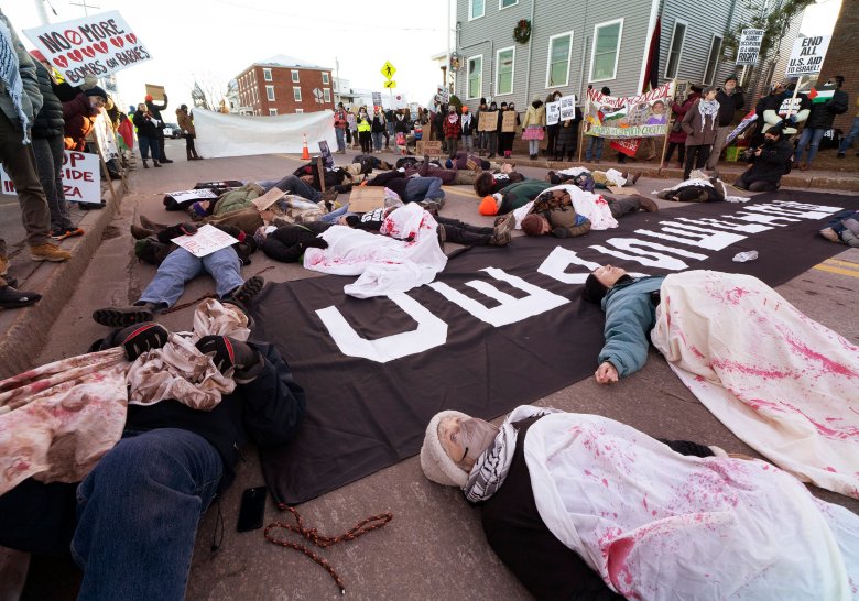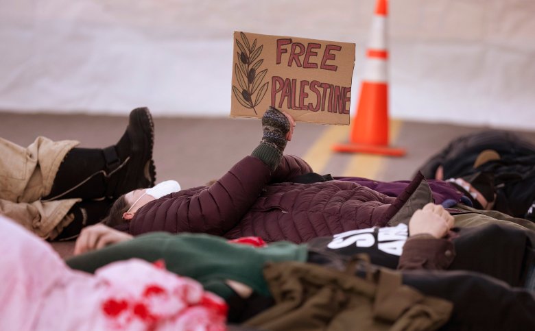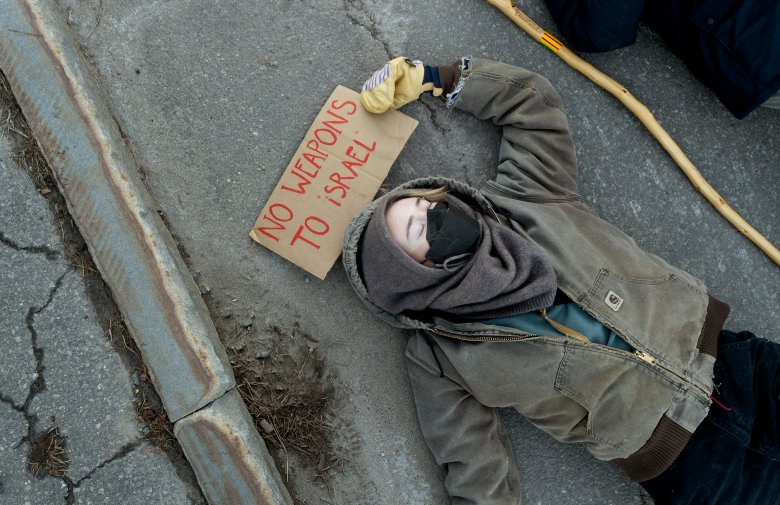Dozens lay prone on cold asphalt, wrapped in sheets splashed with red paint, to block cars trying to leave the shipyard, while others chanted, calling for Israel to end its occupation of the Gaza strip.