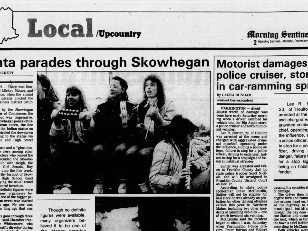 Dec. 5, 1988: Motorist damages police cruiser & Big Apple store in car-ramming spree in Farmington, Santa makes a visit to Skowhegan in parade, and Sidney begins exploration of trash-disposal alternatives