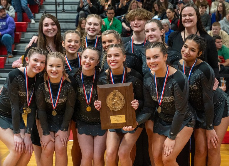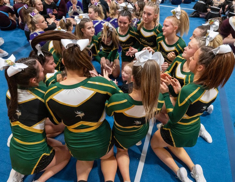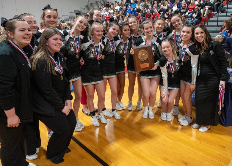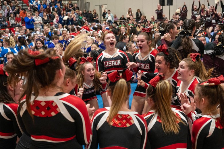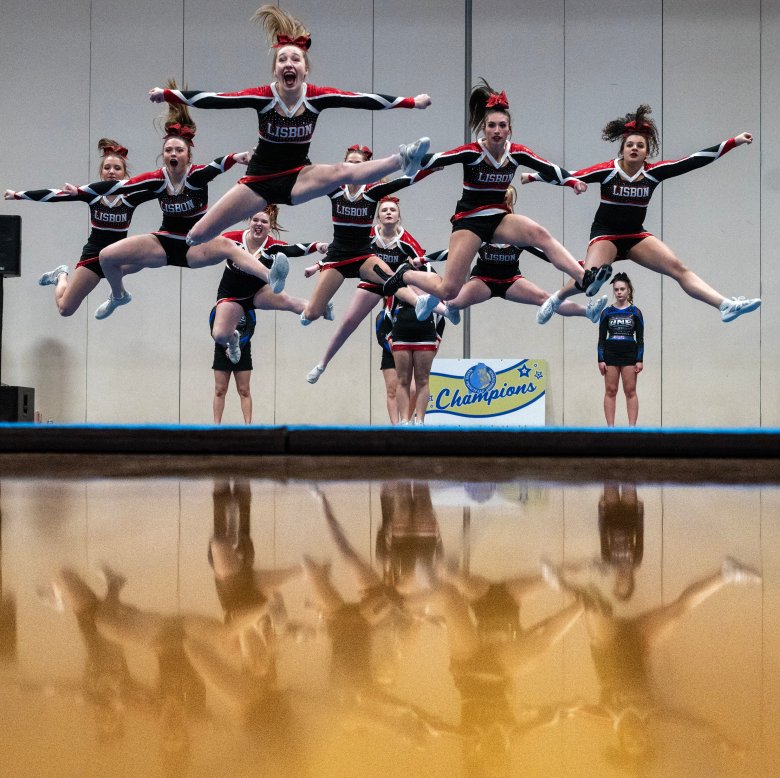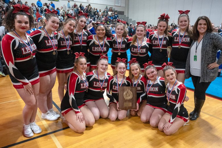 “We worked so hard, and it feels amazing,” Lisbon junior captain Riley Hoyle said of her team’s first-place triumph. “We had to change everything because we lost one of our flyers, so it was a very stressful two weeks since MVCs (Mountain Valley Conference championships). … That just makes it so rewarding. I’m so proud of my team.”