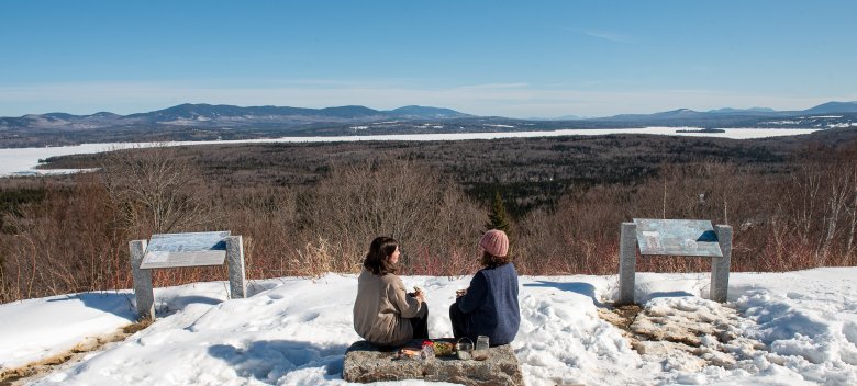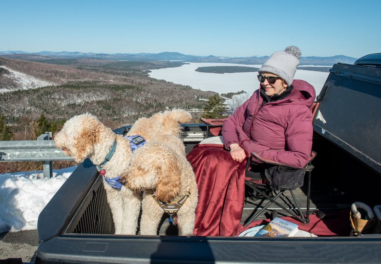 At the other end of the tiny parking lot with a view of snow-covered mountains and lakes, two women from Maine camped out last night, their little grill atop a mound of snow.