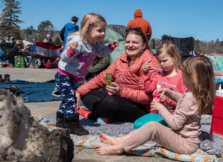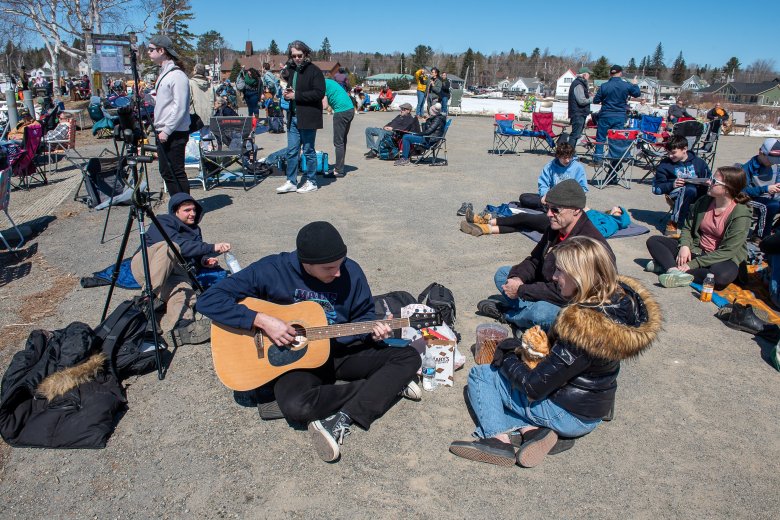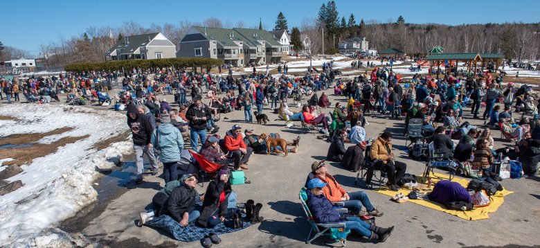 Thousands of people descended Monday on Rangeley, many of them traveling long distances to reach the tourism-driven town. After a slow winter, the town’s business community was happy to see crowds.