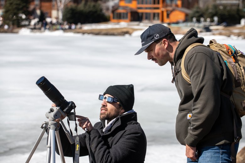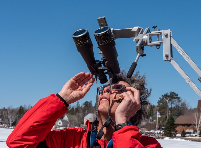 The president of the Southern Maine Astronomers, Rob Burgess of Brunswick, set up a pair of properly shaded binoculars so people at Lakeside Park in Rangeley could see the sun in all its glory before it vanished behind the moon.