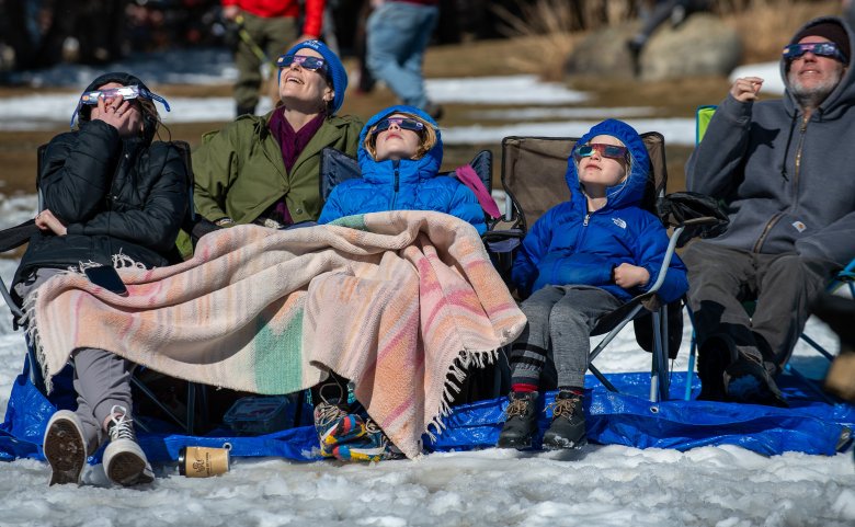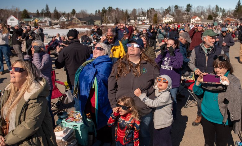 A crowd of 2,000 or more people at Rangeley Town Cove Park cheered. There were many woos and aaaahhhhs as they took off special glasses that let them look at the sun and stared with naked eyes at the astonishing sight overhead.