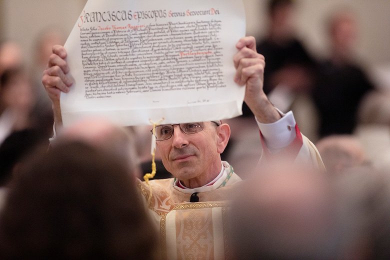 After Cardinal Christophe Pierre, an apostolic nuncio to the United States, read the official mandate from Pope Francis calling Ruggieri to ordination as bishop, Ruggieri held the document above his head and walked slowly through the church showing it to the congregation.