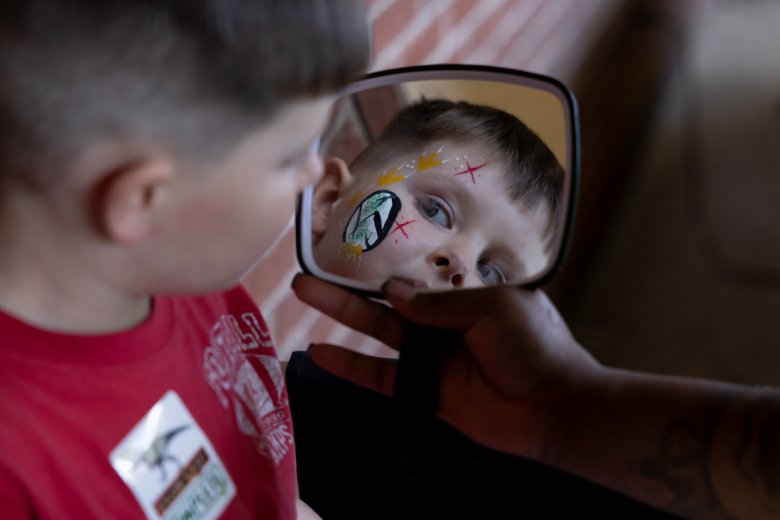 Gianni Kerns, 5, of Auburn, got a ferocious dinosaur painted on his cheek after learning all about the dinosaurs on display.