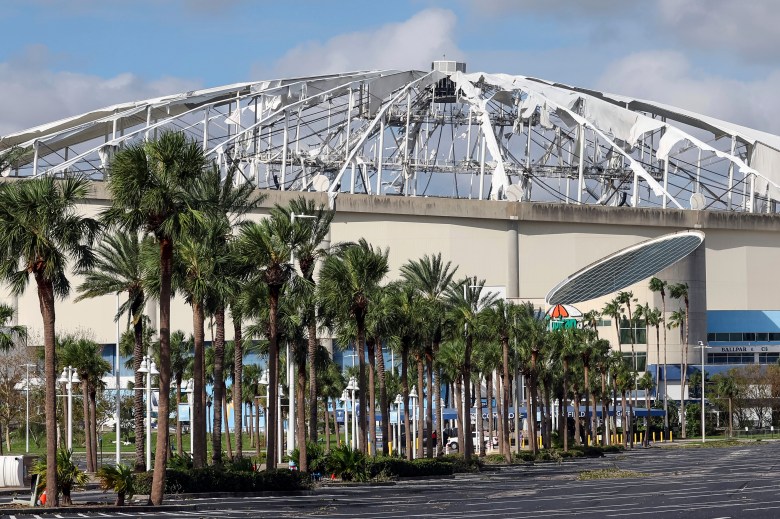 The fabric that serves as the roof of Tropicana Field – home of the Tampa Bay Rays baseball team in St. Petersburg – was ripped to shreds by fierce winds. Debris littered the field.