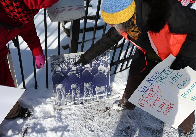 Leonard was wearing a thin, high-visibility vest that she said was about 60 years old. It originally belonged to her father, Richard Leonard, who wore it as he marched with King from Selma to Montgomery, Alabama. One marcher carried a large photograph of the elder Leonard from that march in 1965.