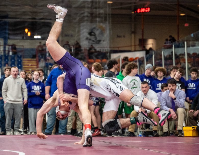 In the 157-pound final, Marshwood’s Cody Bubier appeared to be headed for his second straight championship loss, trailing 7-0 against Justin Batty of Camden Hills after two periods. But Bubier rallied for a 10-9 victory.