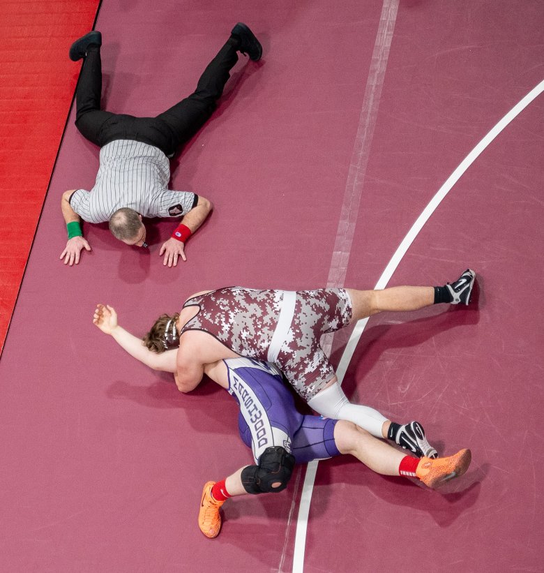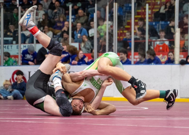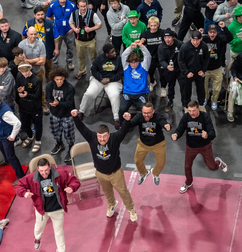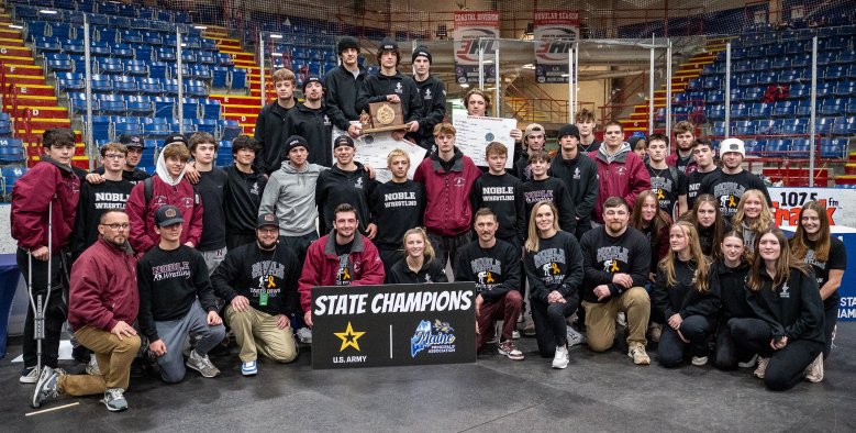 In the team competition, Noble had built an insurmountable lead prior to the championship bouts for its third championship in five seasons and 15th overall. Noble had two three-time champions: senior 138-pounder Kaden Dustin and Ouellette, who won at 150. Heavyweight Sean Leach capped the Knights’ day with a pin in the final match of the meet, prompting the black-clad Noble team to jump as one with joy.