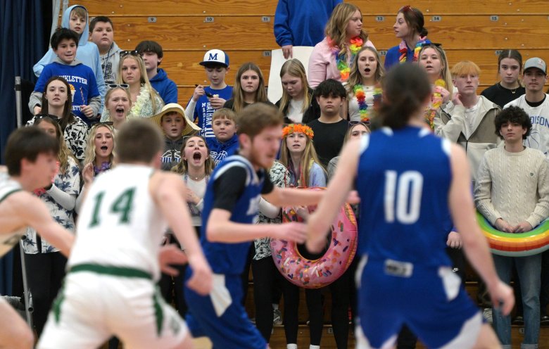With Madison up 12-6, Linkletter opened the second quarter with a 3-pointer. After a Carrabec basket, Linkletter drilled three straight 3s to extend Madison’s lead to 24-8, and his final 3 of the quarter — from NBA distance — made it 29-13. He took a breather with 1:50 left in the half, to a rousing round of applause from the student section.