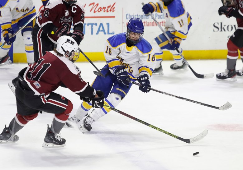 After Morin scored in the first period and Hanson answered in the second, Kents Hill went on the power play with 1:34 to go in the period. The Huskies struck on the advantage moments later when Roy followed up on the carom of his shot for the go-ahead tally with 39.6 seconds left.