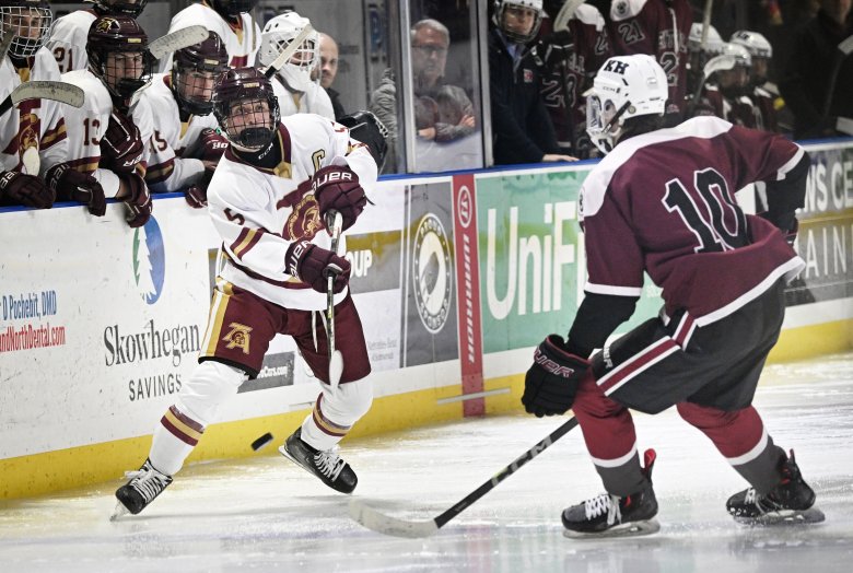 Kents Hill began to control the action after that and went on the power play after a slashing penalty with 7:42 to go. The Huskies brought plenty of zone pressure but the Trojans held firm, with Braden Duane and Pecora blocking hard shots.