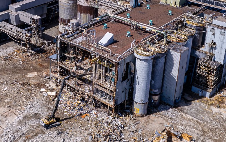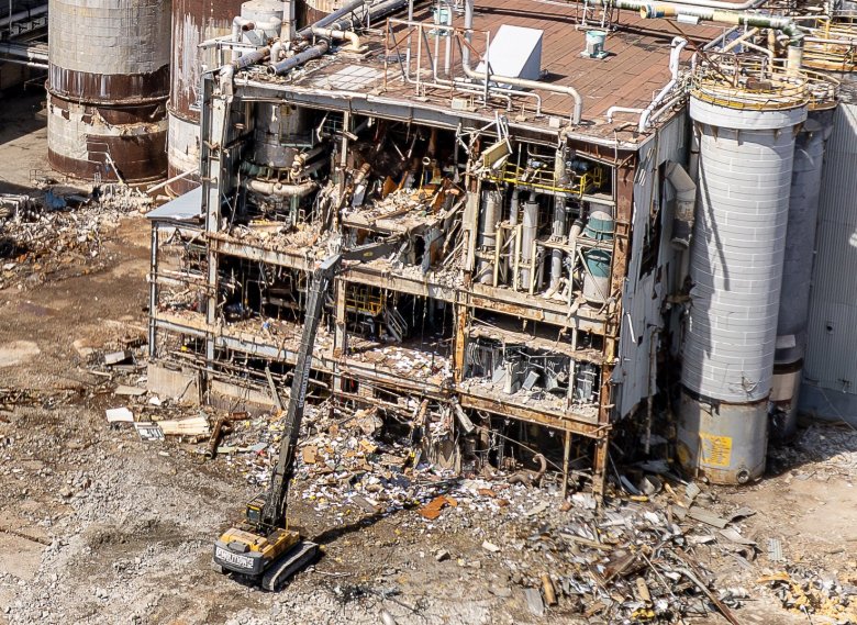 JAY — Demolition on a section of the former Androscoggin Paper mill was continuing Thursday to clear the way for a mulitmillion-dollar engineered wood manufacturing facility at 300 Riley Road.