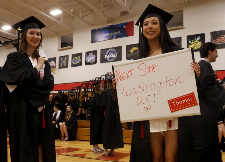 Nyang’au was one of more than 240 students to graduate from Thomas College on Saturday afternoon — the largest class in the private college’s 131-year history. Graduates in black robes filed into Harold Alfond Athletic Center, at the heart of the 180 West River Road campus, to the sound of bagpipes, drums and cheering families.