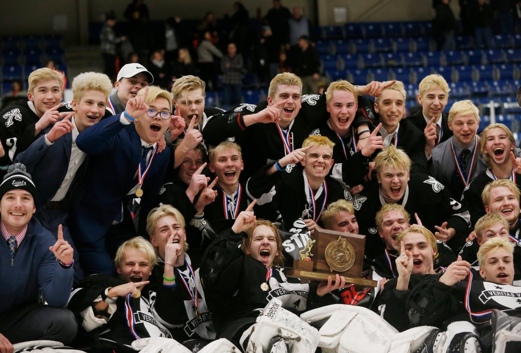 St. Dominic Academy has been one of the state’s hockey juggernauts, for decades. The Saints have 26 state titles, all in Class A. Even as enrollment declined, the team always elected to play in Class A and remained competitive against the state’s largest schools. Tradition defies weight class.