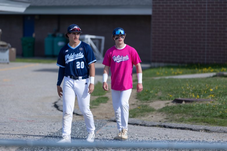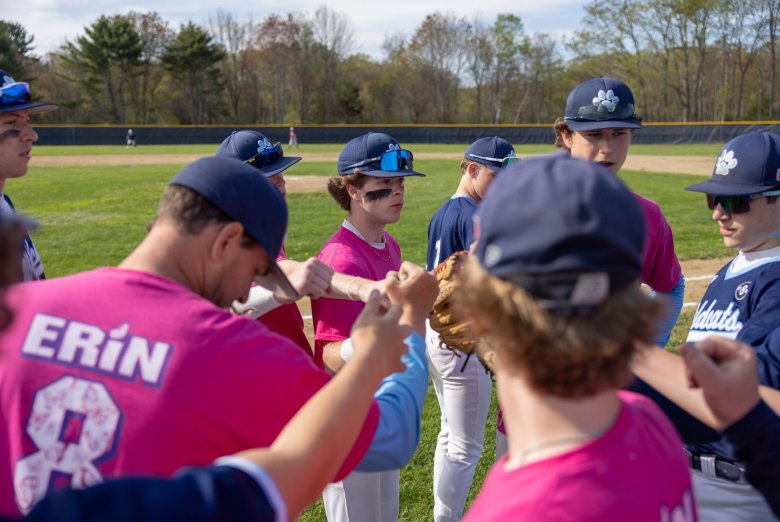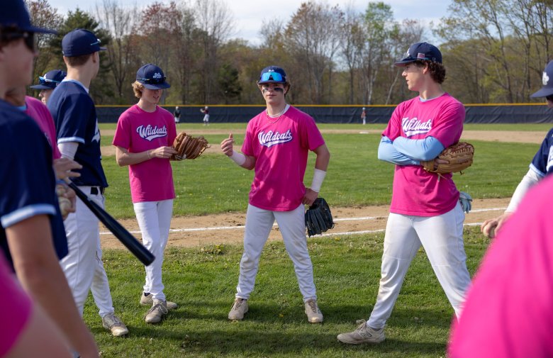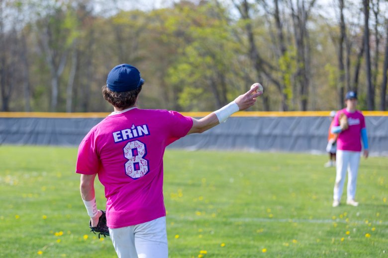 The baseball team, as well as teachers and other students, wear pink T-shirts with “Erin” and her unified No. 8 on the back. Across the front is “Wildcats” with butterflies dotting the letter “I.”