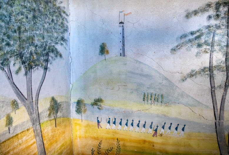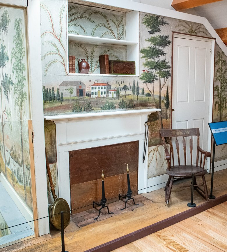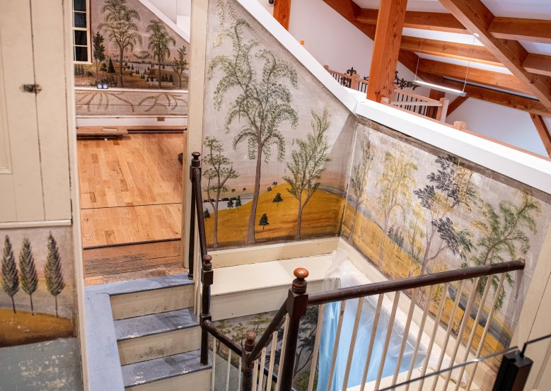 Vine-like vegetation borders many of the murals, meandering along the landscapes. The rooms within the Graham Center are furnished with items contemporary with Poor’s time. “I think it’s really interesting to not only look at the walls, but also see how people, how James Norton and his wife, Lydia, and their two kids, would have lived with these murals,” museum acting curator Lucas Gillespie said.