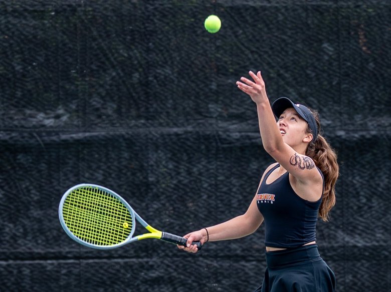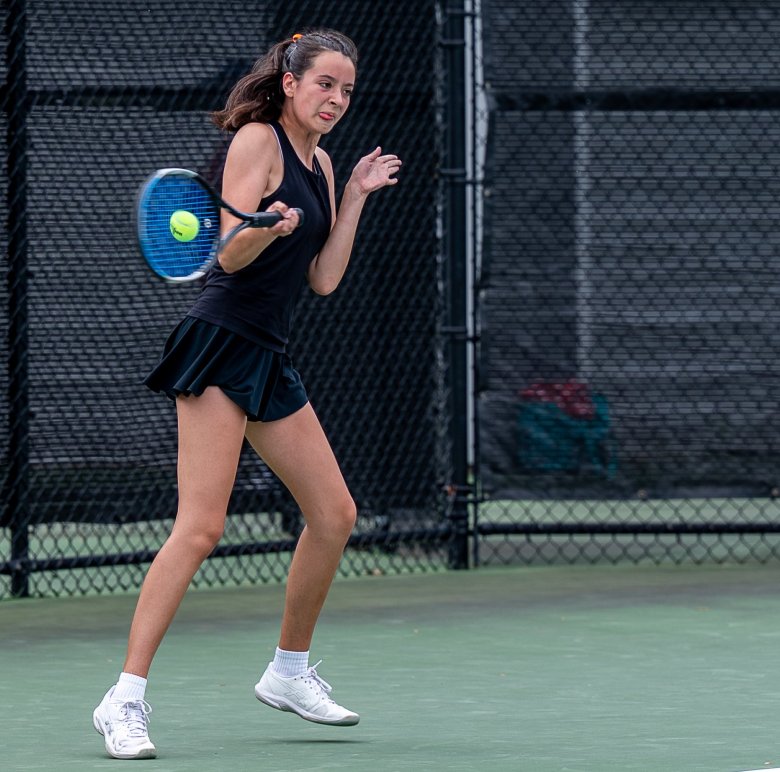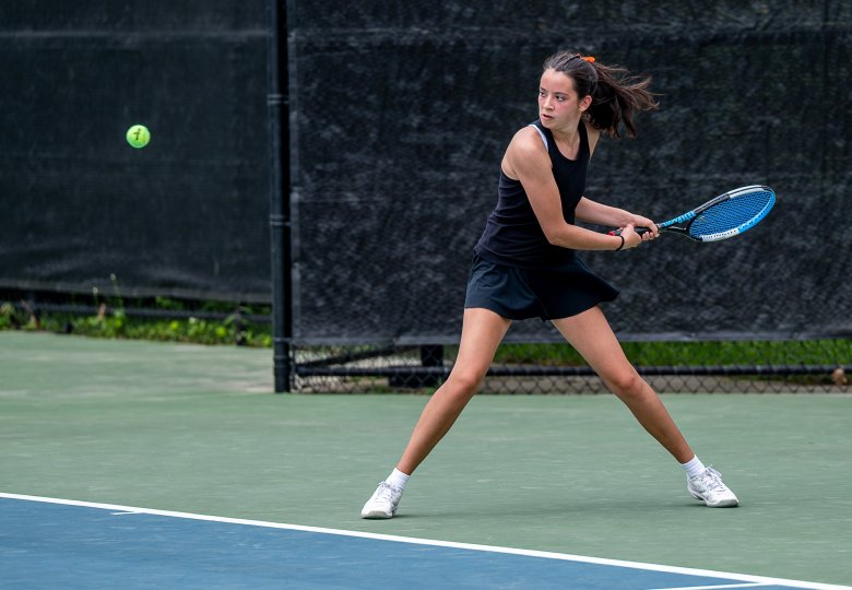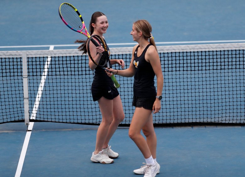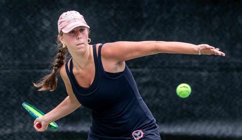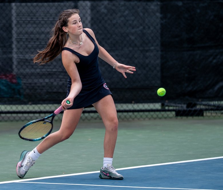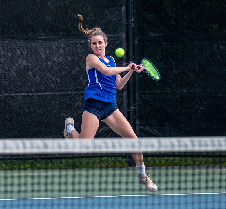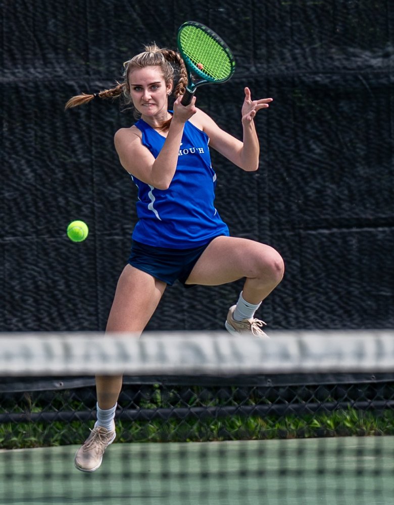 The Windjammers jumped out early and won the first three matches, as Atalanta Roberts beat Lila Patient 6-0, 6-4 in third singles, and the team of Rana Abess and Olive Van Hoewyk — the state champion in doubles — beat Olivia Patient and Izzy Leitzell 6-2, 6-2 in first doubles, then the team of Prescott and Aldridge-Peacock sealed the team victory.