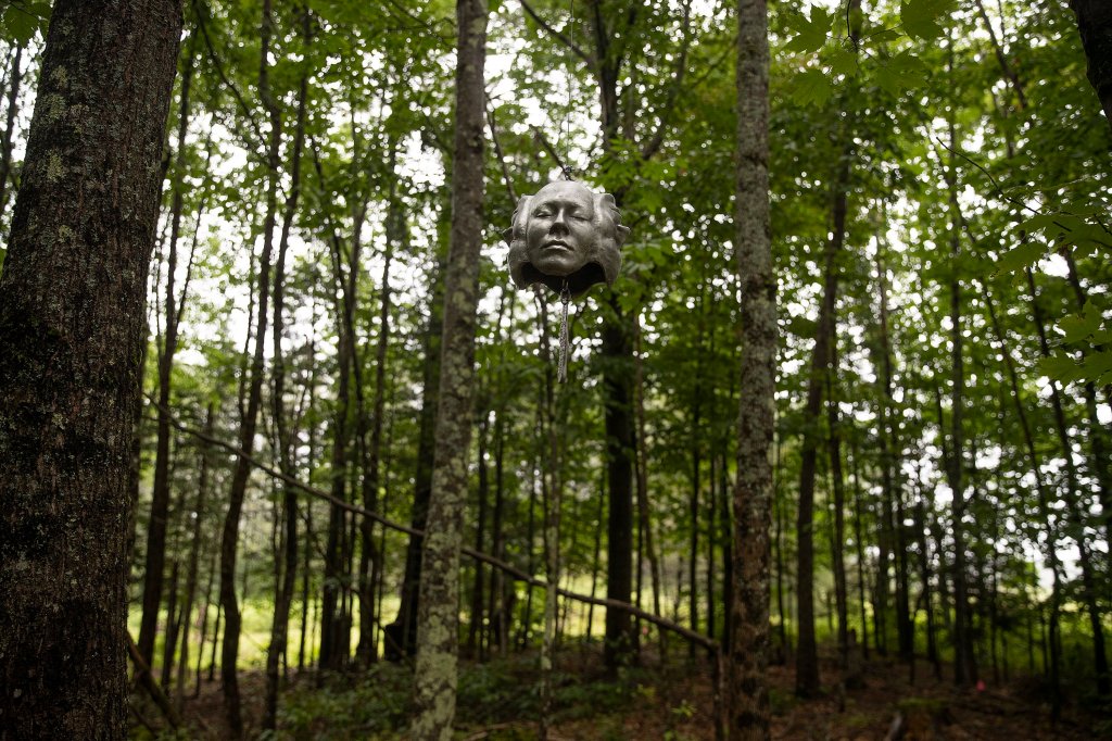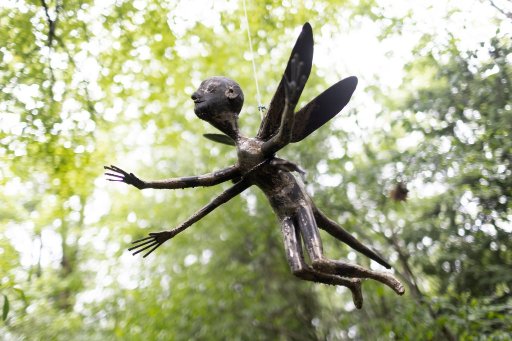 Every turn brings a new treasure — a flock of small wooden birds by Ben Spalding, aluminum faces suspended above the path by Ed Parrish Jr. Miller made a series called “Fish-Fowl of the Far Future,” and visitors can spot the “Grackerel” or even the “Reclusive Bald Sturgeon” in the trees.