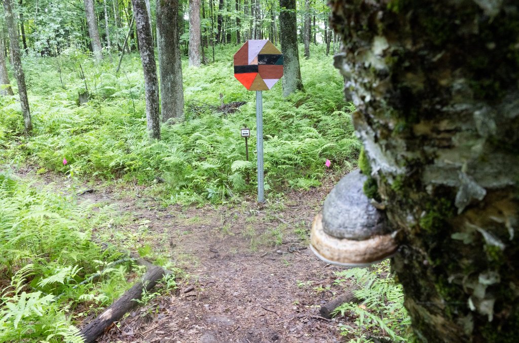 She came up with her idea for this exhibition while traveling a different path — the highway between Montreal to her home in South Portland. While driving, she was studying the road signs. When she got home, she ordered a stop sign and a metal post on the internet. She liked the idea of walking through the forest and finding that familiar octagon. She ended up making three signs that mark the trail in different places, working with clay to form geometric patterns on their surfaces. The usual letters are gone, but the directive is the same.