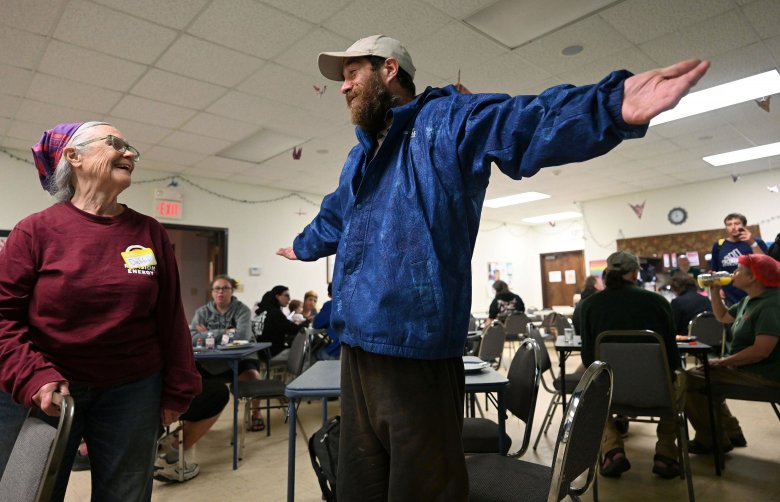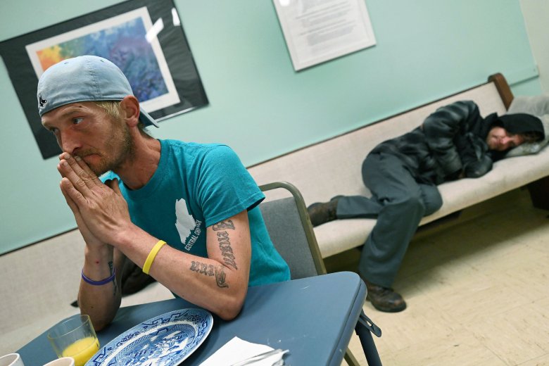 He’s using crutches to get around now, and he was in good spirits during a Saturday morning breakfast at Universalist Unitarian Community Church in Augusta. He, Meserve and about 50 other people who are homeless gather there weekly for a fresh meal and a place to relax, and an outlet to charge their phone, if they have one.