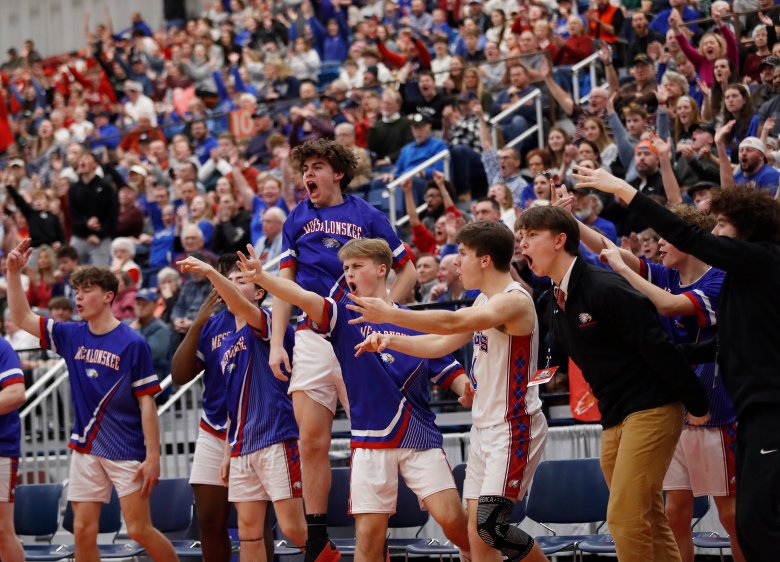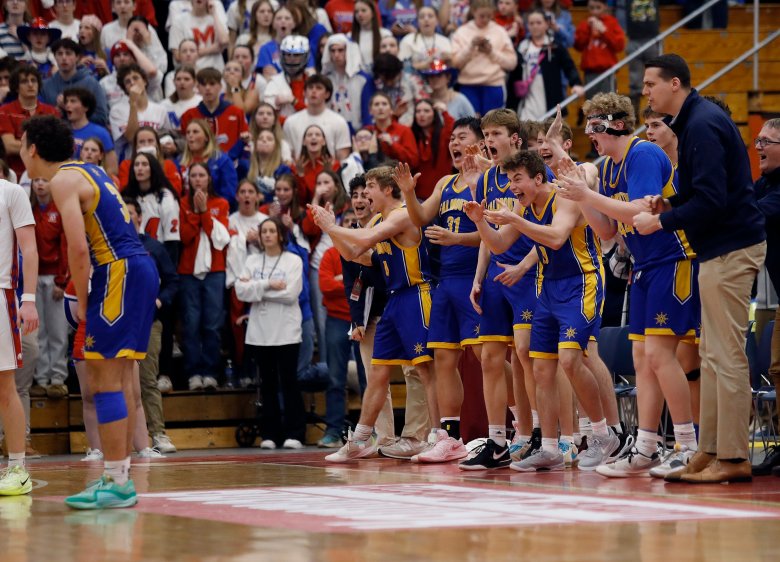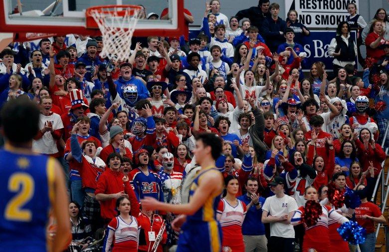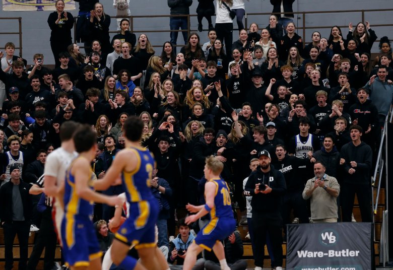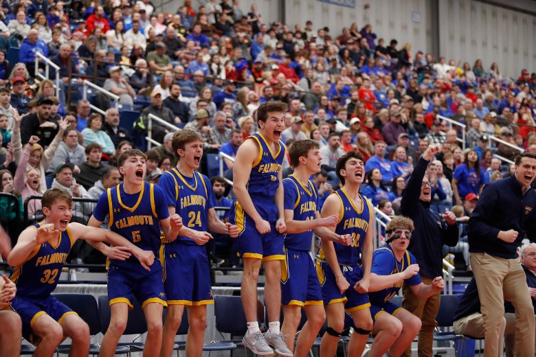 Looking behind him, Smith saw a wall of blue and red stretching to the top of the Augusta Civic Center rafters; across the court, Falmouth fans in blue in yellow, and countless spectators filling the extra seating; to his side, two packed student sections, loud as could be.