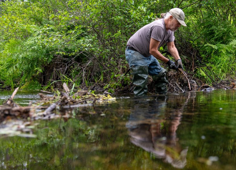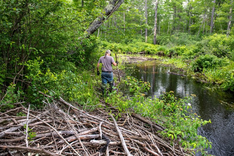 Last July, a structure appeared at the Winterbrook outlet again, but Hughes suspected it was a beaver dam analog — a structure designed to mimic beaver activity and attract them, used primarily in western states where beavers were hunted and trapped nearly into extinction.