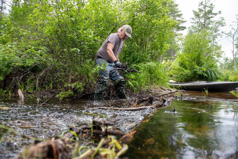 Over the course of an hour, the Sun Journal recorded him pulling more than 60 substantial-sized rocks from the artificial dam that were layered on top of sticks and debris to hold it all in place. Hughes said there is a second layer of rocks remaining in the outlet. The sticks were old and brittle and clearly had been dried out for some time, as they easily snapped in two.