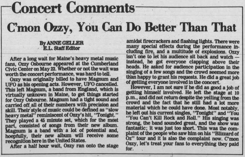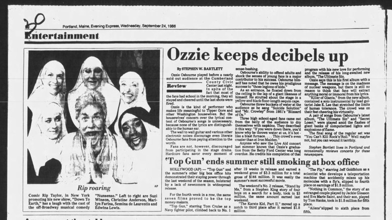 An Evening Express review published Sept. 24, 1986, noted that Osbourne could barely be heard amid “the wall to wall guitar and various other electronic noises (that) discourage even literate Osbourne fans from paying attention to the words.”